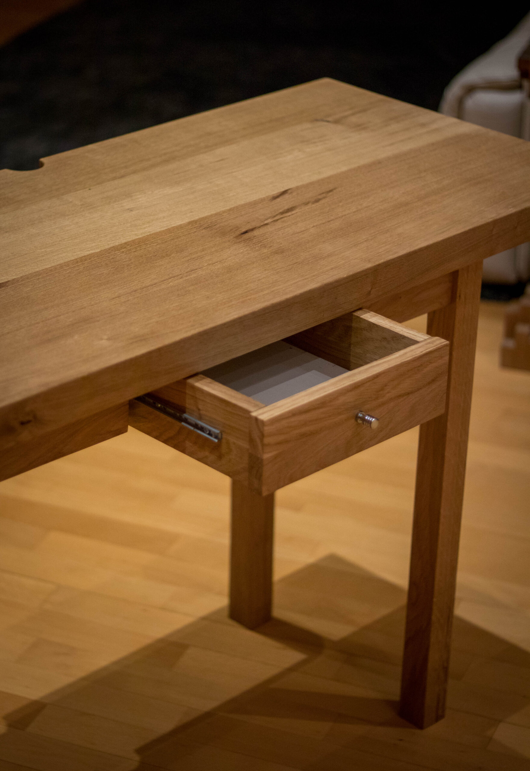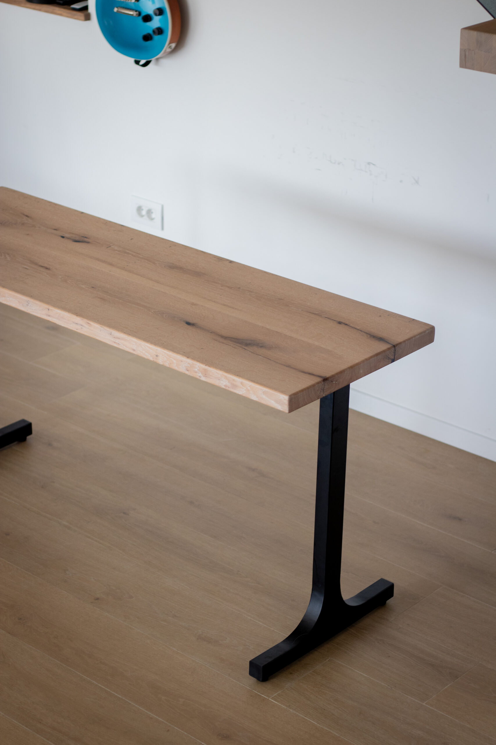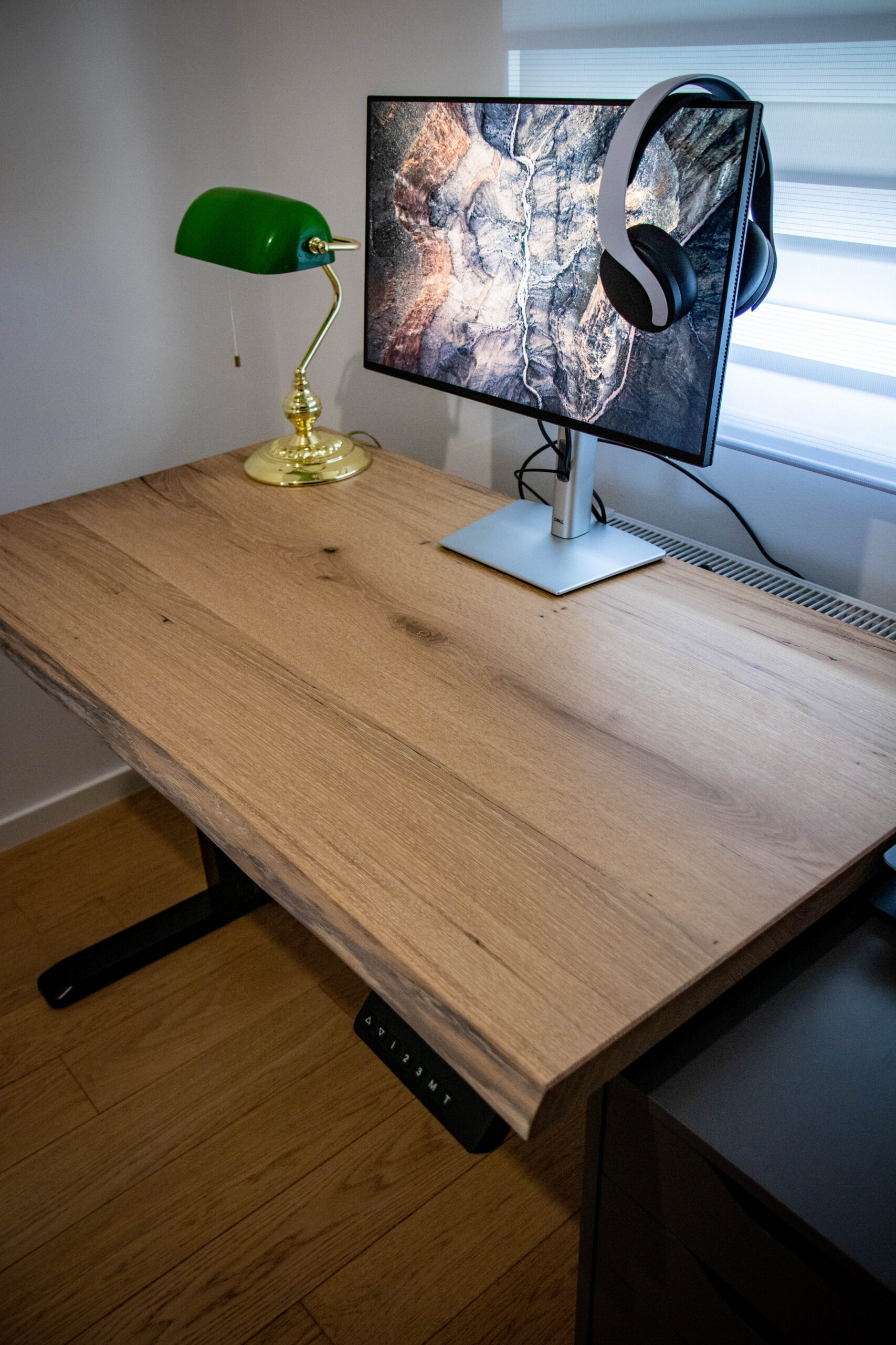 A live edge oak desk with adjustable sit-stand metal frame and black epoxy accents.