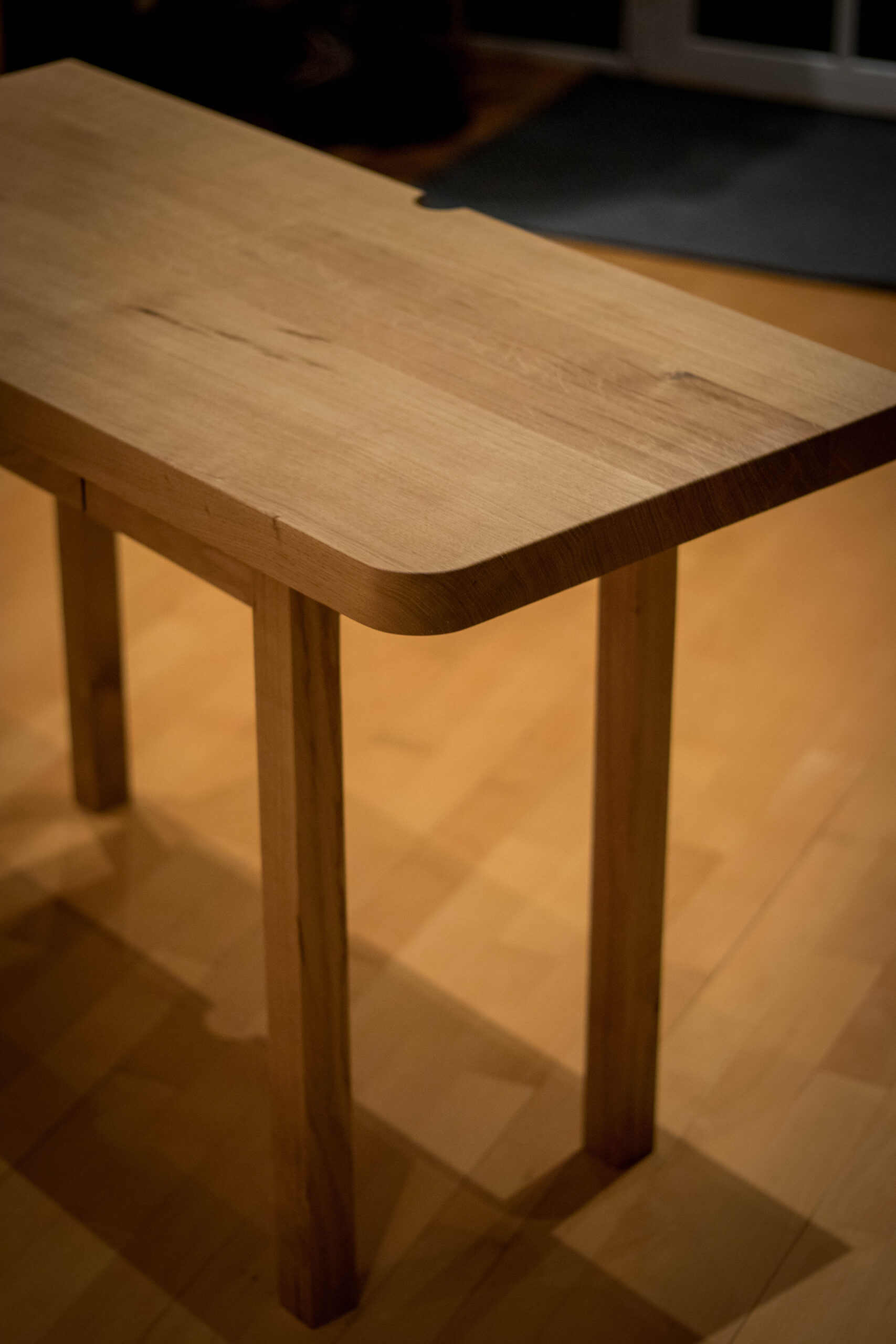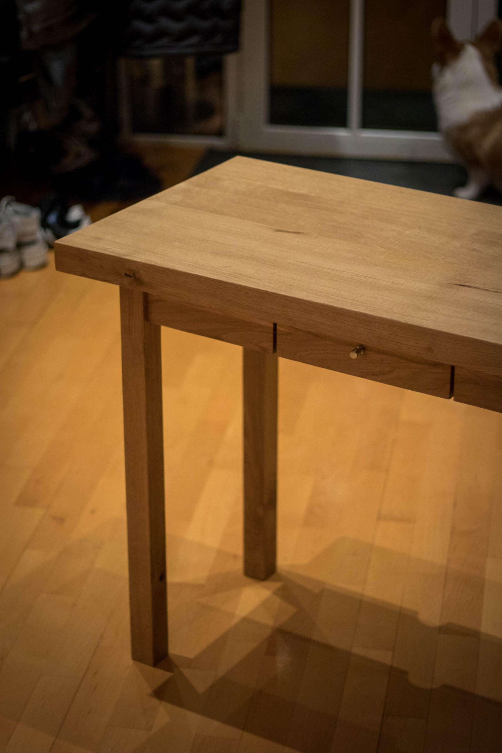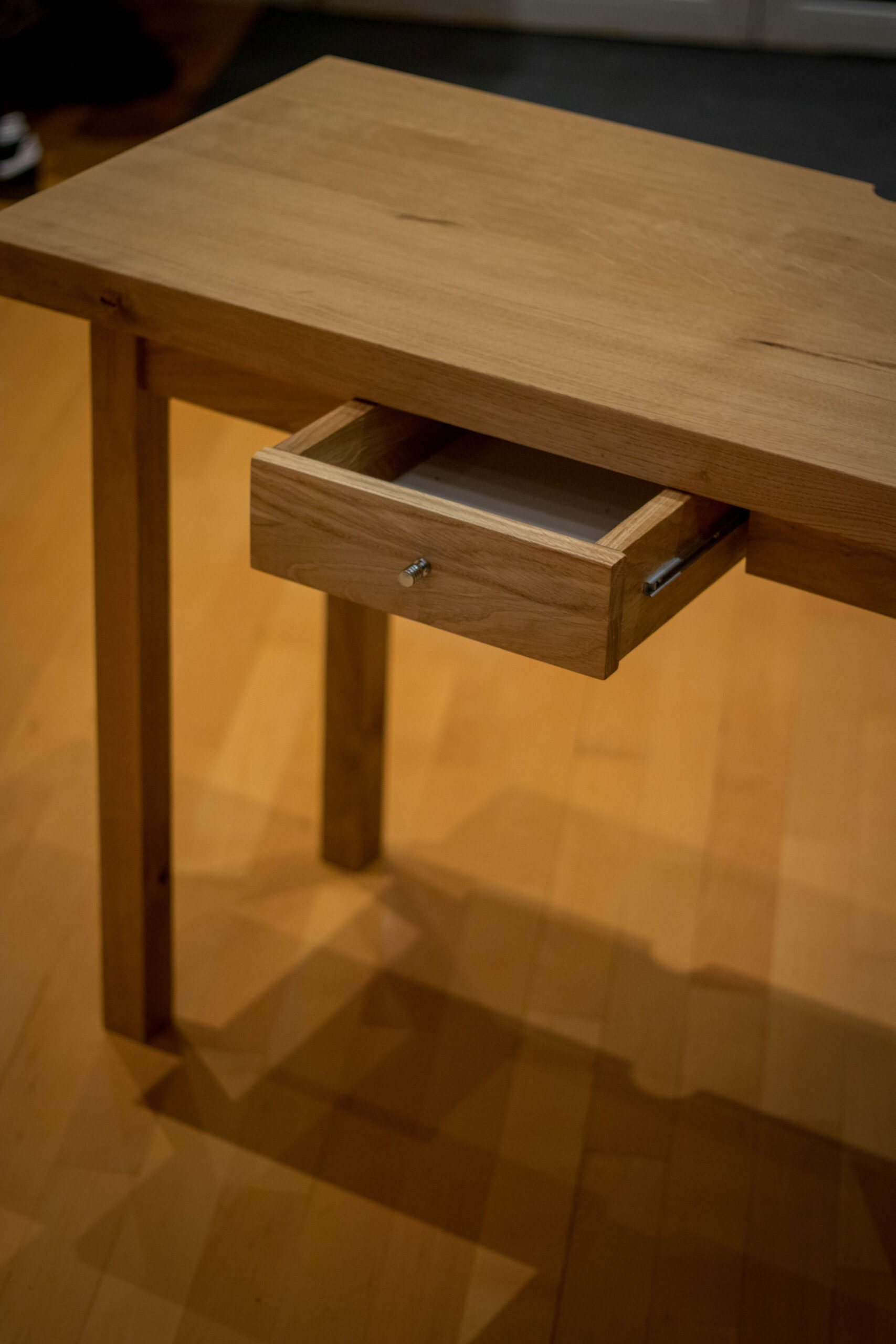 A live edge oak desk with adjustable sit-stand metal frame and black epoxy accents.